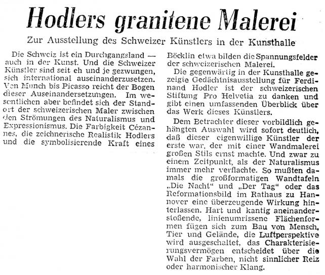 En 1954, la Fondation organise une première grande rétrospective Hodler en Allemagne. Son but est de renforcer le prestige du peintre dans l’histoire de l’art européen. Lors du vernissage de l’exposition, le président de Pro Helvetia, Jean-Rodolphe de Salis, présente Hodler comme l’incarnation du génie national et insiste sur l’importance de la Suisse dans les domaines des arts et de la pensée.