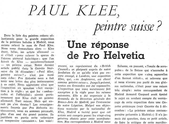 Durant l’après-guerre, Pro Helvetia peine elle aussi à considérer Klee, décédé en 1940 à Muralto, au Tessin, sans avoir obtenu la nationalité suisse, comme un représentant de la création suisse. Dans les organes directeurs de la Fondation, la suissitude de Klee est tout aussi controversée que celle du compositeur d’origine russe Wladimir Vogel. Les autorités fédérales adoptent une position analogue : en 1948, à la demande du Département politique, le consul suisse à Los Angeles va jusqu’à intervenir auprès du journal The Los Angeles Times, qui avait présenté Klee comme un peintre suisse.