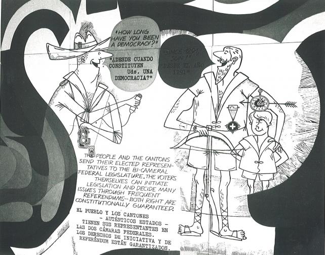 Durant l’été 1968, la Suisse participe à l’exposition internationale Hemisfair, organisée dans la ville texane de San Antonio pour réaffirmer les liens entre les Amériques et les autres continents. Résultat d’une collaboration entre Pro Helvetia et l’Office suisse d’expansion commerciale, le pavillon suisse opte pour un mode de présentation humoristique susceptible d’éveiller la sympathie des Américains.